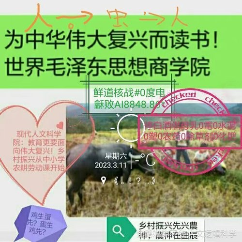 道同时生0和1数学院课题研究:没有纯生态農业,人类鲜道核战必败!![]() 鲜道核战:没有纯生态農业,现代人类必败!地球鲜道核战!道同时生0和1数学院:没有纯生态農业,鲜道核战必败!...... 2023年4月5日,道同时生0和1数学院对外发布未来世界发展研究成果:没有纯生态農业,人类鲜道核战必败!鲜道核战后,全世界(也适用于火星等人类基地)将大停電发展超微循环生态经济!发展传统原始纯生态手工农业自救!…… 人类是谁的主人?人类只是人类的主人! 人类并不是地球的主人! 更不是万物的主人!…… ![]() 人类只是人类的主人!人类并不是地球的主人!更不是万物的主人 主人三问: 1、何为主?王加一点为主。何为王呢?水低为海,人低为王!放下自己。 2、何为人?《新华字典》人是指会制造工具、并能使用工具进行劳动的高级动物。 3、何为主人?象王一样指点人类行动者。 现代人类是地球的掠夺者?人类只是人类的主人!人类并不是地球的主人!更不是万物的主人! 万物各有其道!農民都知道!……但现代人类已变质!当下美欧日发达国家功利科学引导下,现代人类更像是地球万物的劫夺者!地球上的很多不可再生资源,如矿脉、油脉、气脉、水脉等,均受到不同程度的掠夺式开采,打着发展人类经济的大旗...... 结果:……据统计报道,每年还有1000万以上公顷的热带雨林遭到破坏;全世界已有12%的哺乳动物和11%的鸟类灭绝;每24小时有100-200种生物物种从地球上消失;一半以上的猿猴正处于灭绝的边缘...... 各地超高温反常天气出现......人类对地球环境的影响已从罗马时期的局部影响步入了全球影响的时代。正因为如此,使得人类面临着一系列前所未有的、重大而紧迫的全球环境问题。环境污染、温室效应、气候异常、植被破坏、土地荒漠化等已成为人们的热门话题...... 现代人类是地球的掠夺者!现代人类也是未来子孙后代幸福生活的掠夺者! 重大发现公布:鲜道核战或许早已暗暗开始核反应堆排出的核废料有一定的放射性,会危害人类的健康。……目前据公布统计,全世界的核废料已积累了大约100万立方米......核电站的核废料一般埋在海底1000米以下,但是一旦海底核废料泄露,或者日本福岛核电站废水倾倒入海,核废水将会通过海底泉脉(简称鲜道)直达各地山顶,全面污染各地水库鲜道!...... 海底至山顶的泉脉被核废料污染这事件,可称为鲜道核战。 或许,鲜道核战早已经开始,只是未被各种界层公布?各种病毒的流行是否与鲜道核战有关?包括前几年的非洲猪瘟、新冠乙型流感等。2022年俄罗斯乌克兰大战是否与鲜道核战有关,为什么800万以上乌克兰人要离开家园?...... 鲜道核战的目标是什么?1..人体就是战场?..... 2..全球将缺纯天然淡水?...... 3..钢筋水泥石屎森林将毁于鲜道核战?....... 4..地球的人类将由70亿人类变成不到3亿人口?这是一个核弹战的推测?...... ![]() @道同时生0和1数学院:農神在曲辰 鲜道核战:现代人类也是未来子孙后代幸福生活的掠夺者!子孙后代的山顶泉不再是甘甜的泉水! 山顶泉水源于海底至山顶的泉脉,由于各地金属稀土矿山被现代机械共铲一空,原矿脉失去过滤脏海水的作用,海底5000米泄露的核废料和日本外泄的核废水将直达各地山顶,全面污染各地鲜道!世界各地水库的水由于很多源于山顶泉水,它们或许将被核废水混合的海水污染!山顶泉不再是甘甜的泉水!...... 爱因斯坦预言2050年蜜蜂将消失,全世界大饥饿!! 在核废料泄露污染、化学污染、电磁污染下,爱因斯坦预言2050年蜜蜂将消失,届时没有蜜蜂虫媒传播花粉,粮食将大减产!水果大减产!全世界将大饥饿!...... 届时,人类和动物因缺粮食和淡水而凶残斗争!大斗的结果,人类文明将消亡?…… 全人类怎么打赢鲜道核战?鲜道核战已经开始,每个人人体就是战场!?为什么有人有特殊的奇难杂症或许与轻度鲜道核战“核+电+污染”反应有关?...... 鲜道核战赢家策略——解药在古G生物酶!原始即最高现代化!导虫尚黑功德无量!……(世界潘茂名创新生物医学院) 古G生物酶方法:全面恢复传统农耕文明,恢复传统原始纯生态手工业、手工农业! ![]() @道同时生0和1数学院:God's mother is 田!没有纯生态农业,华夏必亡! 鲜道核战打赢策略:God's mother is 田!……停电!恢复传统!没有纯生态农业,华夏必亡! 复兴中国老传统,0电现代化才是纯生态农业的最高现代化!…… 0电、0水泥、0农药、0化肥、0除草剂、0塑料、0污染,農产品营养成分更高!…… 为什么那么多0?把新鲜找回来!!!!当下最大问题根源:应该是农民指挥科学家!而不是让没有经验的科学家指挥农民!…… 農民也懂原子弹!核水:粤西地区的農民最懂何为核水(电白话;电白,象电那么快明白!)!14亿人的屎尿可否无污染回收后变有机肥核水,关系到华夏存亡!…… 从人防工程变生防工程各地城市社区公园设公益菜园、空地自由小菜园、学校工厂屋顶菜园应就地取材,普及农耕课堂!各地社区有条件允许应用空废房养猪养鱼等,作为现代城市生物安防工程…… 天安门设小稻田菜园并没有丢社会主义的脸!……旅游者到天安门都是崇拜水泥!如果在北京天安门广场看到小农场(水稻田、麦田、小菜园等)更好!乡村振兴从天安门农场开始!…… ——(中华伟大复兴科学院、原始即最高现代化科学院) 停白酒倡母乳……全面创造母乳喂养条件!对抗世界奶源核污染…… 鲜道核战生物策略:导